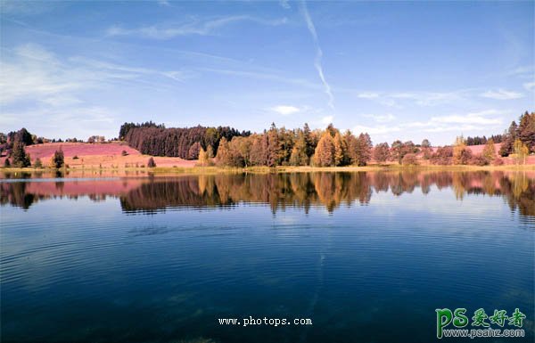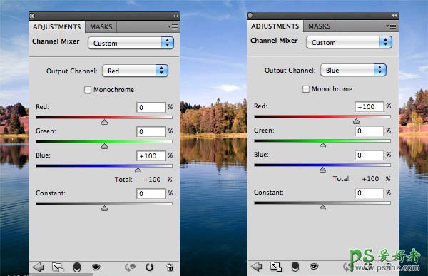 3、选择“图层”-“新建调整图层”-“通道混合器”。在通道混合器中,先将输出通道选为红色,然后将红色滑块拉到0,蓝色滑块拉到+100。然后选择输出通道蓝色,进行相反操作,将红色滑块拉到+100,蓝色滑块为0。