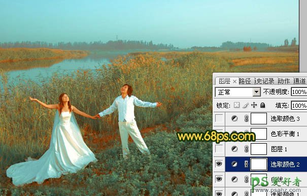PS给晨曦中唯美的江景芦苇情侣婚片调出唯美效果