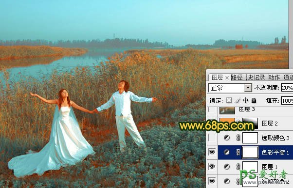 PS给晨曦中唯美的江景芦苇情侣婚片调出唯美效果