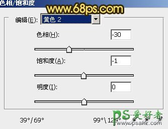 1、打开原图素材,创建色相/饱和度调整图层,选择黄色,用吸管吸取背景树叶颜色再调整,参数设置如图1,效果如图2。这一步把树叶颜色改为暖色。