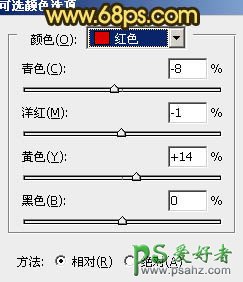 5、创建可选颜色调整图层,对红、黄、中性色进行调整,参数设置如图10 - 12,效果如图13。这一步加强背景部分的暖色。