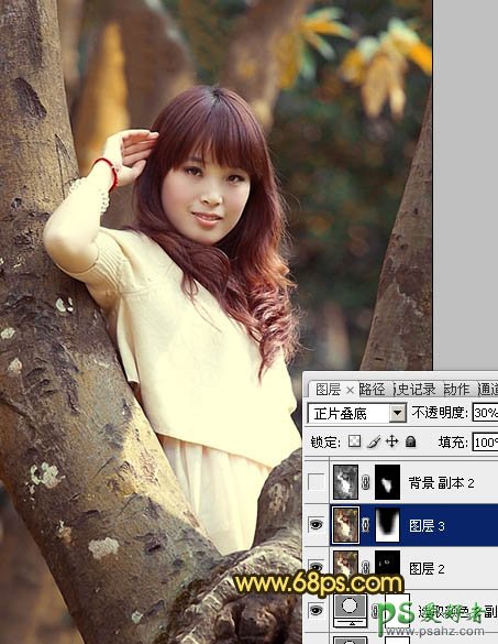 6、新建一个图层,按Ctrl + Alt + Shift + E 盖印图层。简单的给人物磨皮,然后把当前图层复制一层,混合模式改为“正片叠底”,不透明度改为:30%,按住Alt键添加图层蒙版,用白色画笔把底部需要加深的部分擦出来,效果如下图。