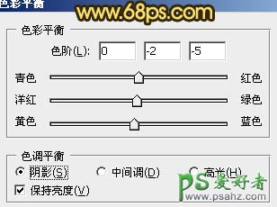 8、创建色彩平衡调整图层,对阴影、中间调、高光进行调整,参数设置如图17 - 19,确定后把图层不透明度改为:30%,用黑色画笔把不需要调色的部分擦出来,效果如图20。