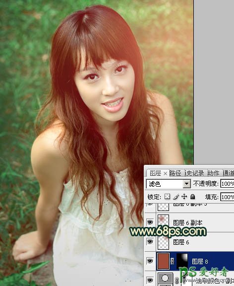 12、新建一个图层,填充棕红色:#9E4B37,混合模式改为“滤色”,按住Alt键添加图层蒙版,用白色画笔把右上角部分擦出来,效果如下图。>