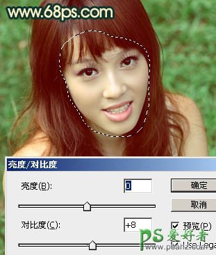 6、用套索工具选取人物脸部,按Ctrl + Alt + D 羽化5个像素后创建亮度/对比度调整图层,参数及效果如下图。这一步简单调亮脸部。>