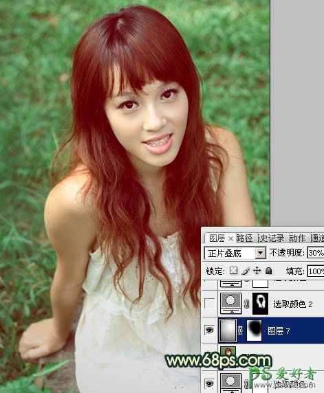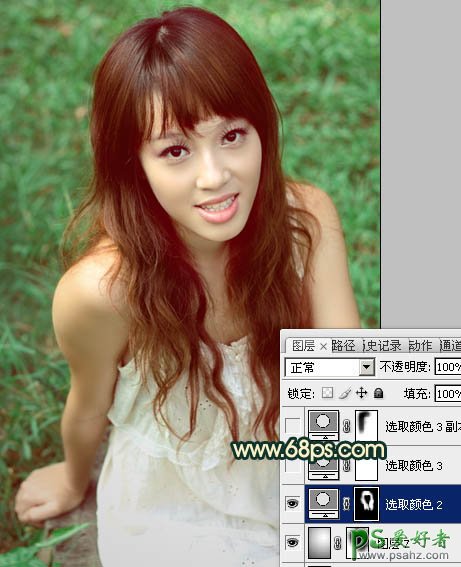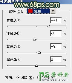 9、创建可选颜色调整图层,对红色进行调整,参数设置如图18,确定后只保留头发部分,其它部分用黑色画笔擦掉,效果如图19。这一步调整头发颜色。>