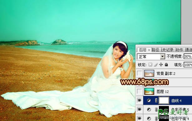 PS调色教程:给海景婚片美女调出暖暖的青色效果