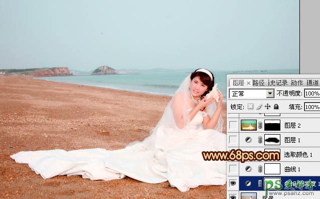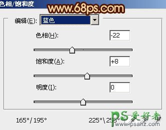 1、打开原图素材,创建色相/饱和度调整图层,选择黄色,用吸管吸取沙滩颜色再调整,参数设置如图1,然后选择蓝色,用吸管吸取天空颜色调整,参数设置如图2,效果如图3。这一步简单改变天空及沙滩颜色。
