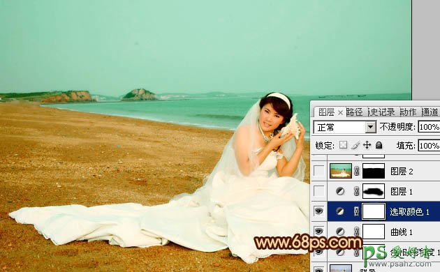 PS调色教程:给海景婚片美女调出暖暖的青色效果