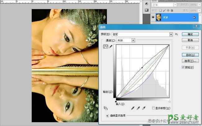 1、先是在PS5里面打开原图,用“曲线”分别调整不同的通道照片。使原本暗红发灰的照片变得亮丽、通透,(分别调整RGB、红、绿、蓝三个通道)调整后合并图层。