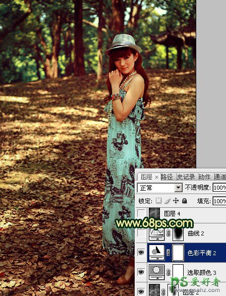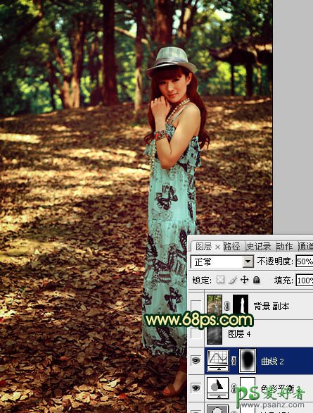 PS调色教程:给树林中的旗袍美女照调出暗调红青色