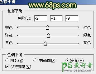 13、创建色彩平衡调整图层,对高光进行调整,参数设置如图32,效果如图33。这一步微调高光部分的颜色。