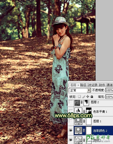PS调色教程:给树林中的旗袍美女照调出暗调红青色
