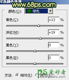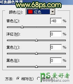 7、创建可选颜色调整图层,对红、黄、绿进行调整,参数设置如图21 - 23,效果如图24。这一步继续加强青色及红色浓度。