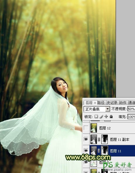 13、新建一个图层,盖印图层。按Ctrl + Shift + U 去色,混合模式改为“正片叠底”,不透明度改为:50%,按住Alt键添加图层蒙版,用白色画笔把底部及中间边缘部分擦出来,效果如下图。这一步给画面增加暗角。