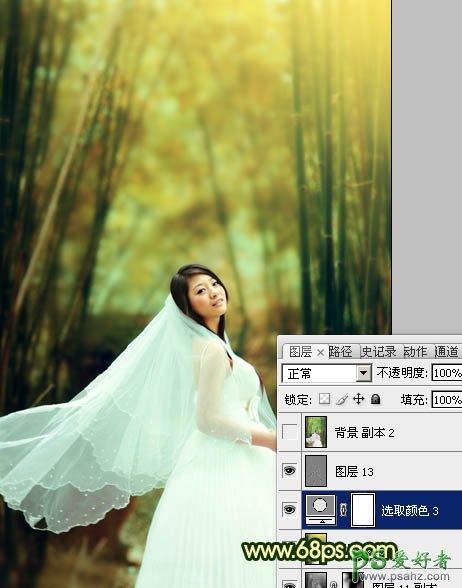 PS调色教程:给漂亮的竹林婚片少女写真照调出古典黄绿色