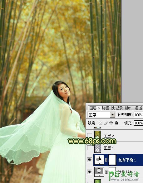 PS调色教程:给漂亮的竹林婚片少女写真照调出古典黄绿色