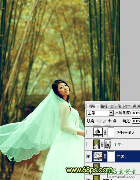 PS调色教程:给漂亮的竹林婚片少女写真照调出古典黄绿色