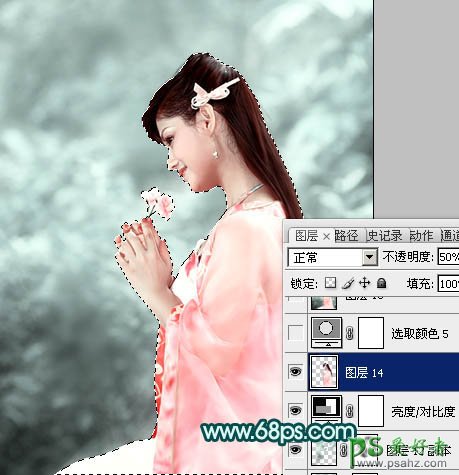 14、新建一个图层盖印图层。进入通道面板,选择绿色通道,按Ctrl + A 全选,按Ctrl + C 复制,选择蓝色通道,按Ctrl + V 粘贴。回到图层面板把图层不透明度改为:50%,效果如下图。