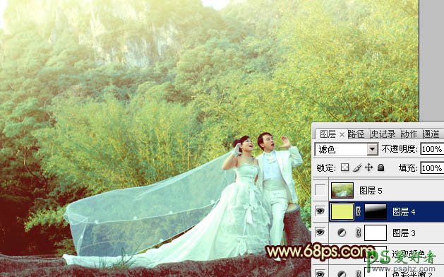 9、新建一个图层,填充淡绿色:#E6EF81,混合模式改为“滤色”,按住Alt键添加图层蒙版,用白色画笔把顶部高光擦出来,效果如下图。