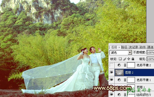 photoshop调出粉嫩的黄绿色情侣婚纱写真照