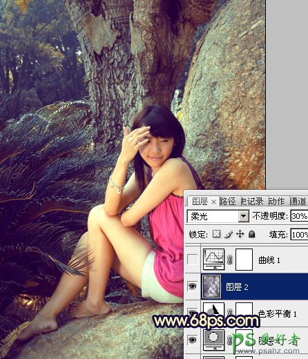 4、按Ctrl + Alt + ~ 调出高光选区,按Ctrl + Shift + I 反选,新建一个图层填深蓝色:#330C4E,混合模式改为“柔光”,不透明度改为:30%,效果如下图。这一步给图片暗部增加蓝色。