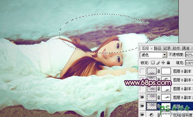 12、新建一个图层,用椭圆选框工具拉出下图所示的椭圆选区,按Ctrl + D 羽化50个像素后填充暗紫色:#5D3963,混合模式改为“滤色”,再适当降低图层不透明度,效果如下图。