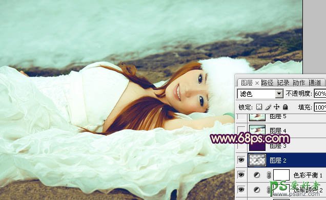 5、按Ctrl + Alt + ~ 调出高光选区,按Ctrl + Shift + I 反选,新建一个图层填充深蓝色:#0C2837,混合模式改为“滤色”,不透明度改为:60%,效果如下图。