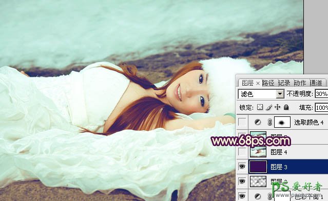 6、新建一个图层填充暗紫色:#381159,混合模式改为“滤色”,不透明度改为:30%,效果如下图。这一步给画面增加一些淡紫色。