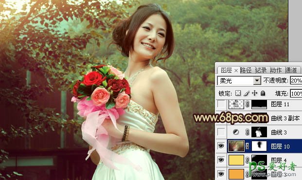 14、新建一个图层,盖印图层。执行:滤镜 > 模糊 > 高斯模糊,数值为5,确定后把图层混合模式改为“柔光”,不透明度改为:20%,加上图层蒙版,用黑色画笔把人物部分擦出来,效果如下图。