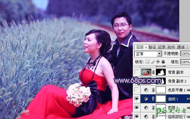 PS调色教程:给铁轨上的情侣婚纱照调出重口味暗蓝色