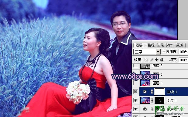 7、新建一个图层,按Ctrl + Alt + Shift + E 盖印图层。简单给人物磨一下皮,然后创建曲线调整图层,稍微把全图调暗一点,大致效果如下图。