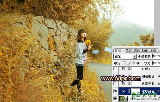 ps人像调色教程:给马路边漂亮MM写真照调出橙黄的秋季色