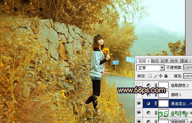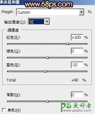 3、创建通道混合器调整图层,对红色进行调整,参数设置如图10,效果如图11。这一步给高光部分增加一些青色。