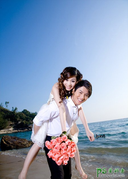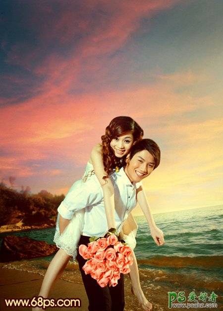 今天我们来和大家一起学习一篇漂亮影楼婚片后期处理教程,PS婚片后期调色实例教程,photoshop给一对浪漫的爱侣婚片调出漂亮的霞光色,朝霞色在图片处理中是应用非常广泛的。处理的方法也有很多。常见的就是调色及换背景法。大致过程:先用调色工具把画面的主色转为暖色,以橙黄及青蓝色为主色。然后把天空部分装饰上云彩素材。后期微调一下人物及环境色即可。