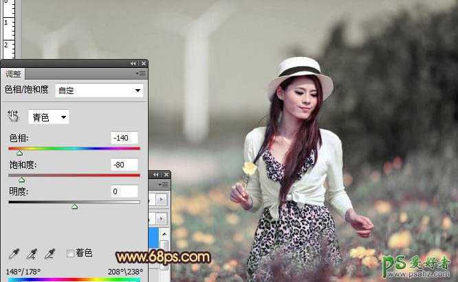 2、创建色相/饱合度调整图层,选择青色,用吸管工具吸取天空上的青色部分,通过降低饱合度,使其颜色接近下方的色调,参数如图,效果如图。