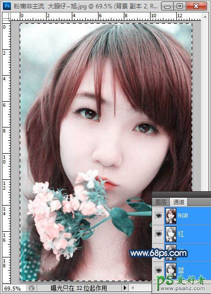 2、这一步最为关键,因为通过这一步来美化人物肤色,所以也在这篇简单的快速教程中起到关键作用。按CTRL+J,复制一层修补过后的照片并转换到通道面板,选择绿通道,按CTRL+A全选,CYRL+C复制,再选择蓝通道,按CYRL+V粘贴,按CTRL+D取消选区,OK,做到这一步,人物偏黄的肤色己经变成粉色的了,效果如图。