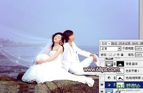 photoshop给浪漫情侣海景婚纱照调出淡雅的艺术风格