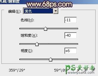 2、创建色相/饱和度调整图层,选择黄色,用吸管吸取石头部分的黄色再调整,参数设置如图6,确定后用黑色画笔把人物部分擦出来,效果如图7。这一步改变石头部分的颜色,统一整体色调。