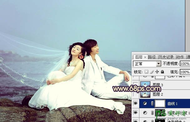 7、创建曲线调整图层,对蓝色进行调整,参数设置如图14,效果如图15。这一步给画面增加一些淡黄色。