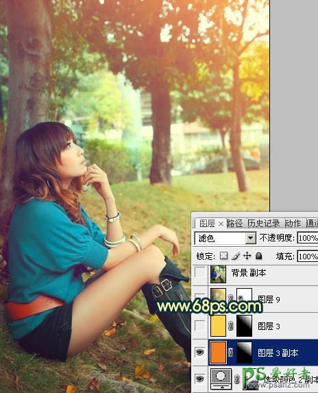 10、新建一个图层,填充橙红色:#F27F22,混合模式改为“滤色”,按住Alt键添加图层蒙版,用白色画笔把右上角部分擦出来,效果如下图。