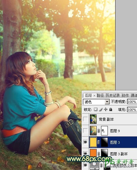 11、新建一个图层,填充黄色色:#FCD14B,混合模式改为“滤色”,按住Alt键添加图层蒙版,用白色画笔把右上角部分擦出来,效果如下图。这两步增加画面的高光。