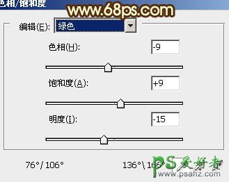11、创建色相/饱和度调整图层,选择绿色,用吸管吸取背景颜色,微调一下颜色,效果如图28。