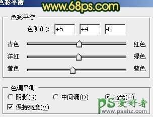 14、创建色彩平衡调整图层,对高光进行调整,参数设置如图26,确定后把图层不透明度改为:70%,效果如图27。
