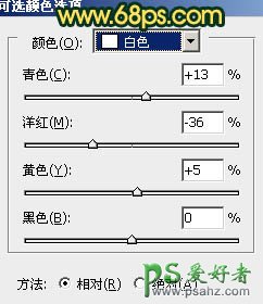 3、创建可选颜色调整图层,对白色、中性色、黑色进行调整,参数设置如图3 - 5,效果如图6。这一步给背景暗部增加暗绿色。