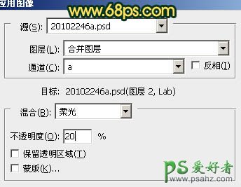 6、执行:图像 > 应用图像,参数设置如图13,效果如图14。确定后选择菜单:图像 > 模式 > RGB颜色,选择不合拼。这两步处理是增加图片的红色及暗绿色。