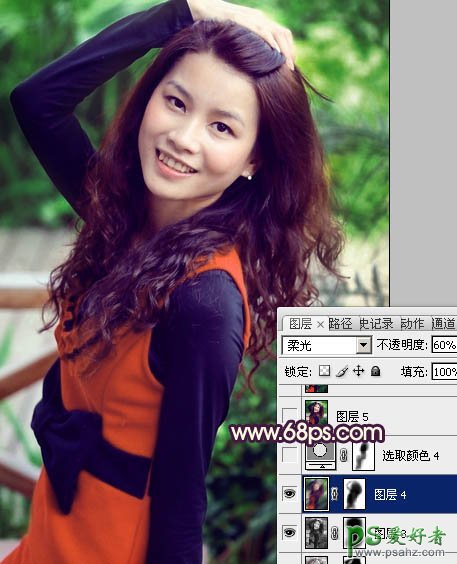 11、新建一个图层,按Ctrl + Alt + Shift + E 盖印图层。执行:滤镜 > 模糊 > 高斯模糊,数值为5,确定后把图层混合模式改为“柔光”,不透明度改为:60%,加上图层蒙版,用黑色画笔把人物部分擦出来,效果如下图。