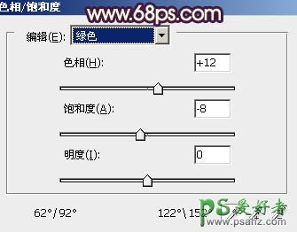 8、创建色相/饱和度调整图层,对绿色进行调整,参数设置如图21,效果如图22。