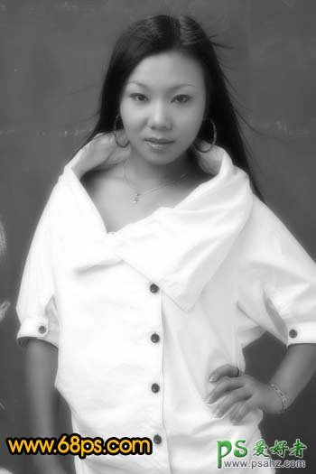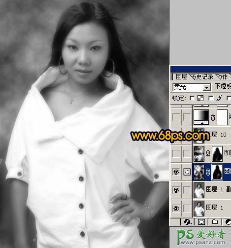 3、新建一个图层,按字母“D”把前背景颜色恢复到默认的黑白,执行:滤镜 > 渲染 > 云彩,确定后按Ctrl + Alt + F 加强一次,然后把图层混合模式改为“柔光”,加上图层蒙版用黑色画笔把人物部分擦出来,如图4。