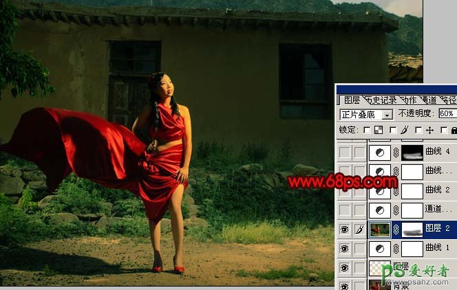 3、新建一个图层,按Ctrl + Alt + Shift + E 盖印图层,图层混合模式改为“正片叠底”,图层不透明度改为:60%,加上图层蒙版把人物脚下的草地部分涂出来,如下图。